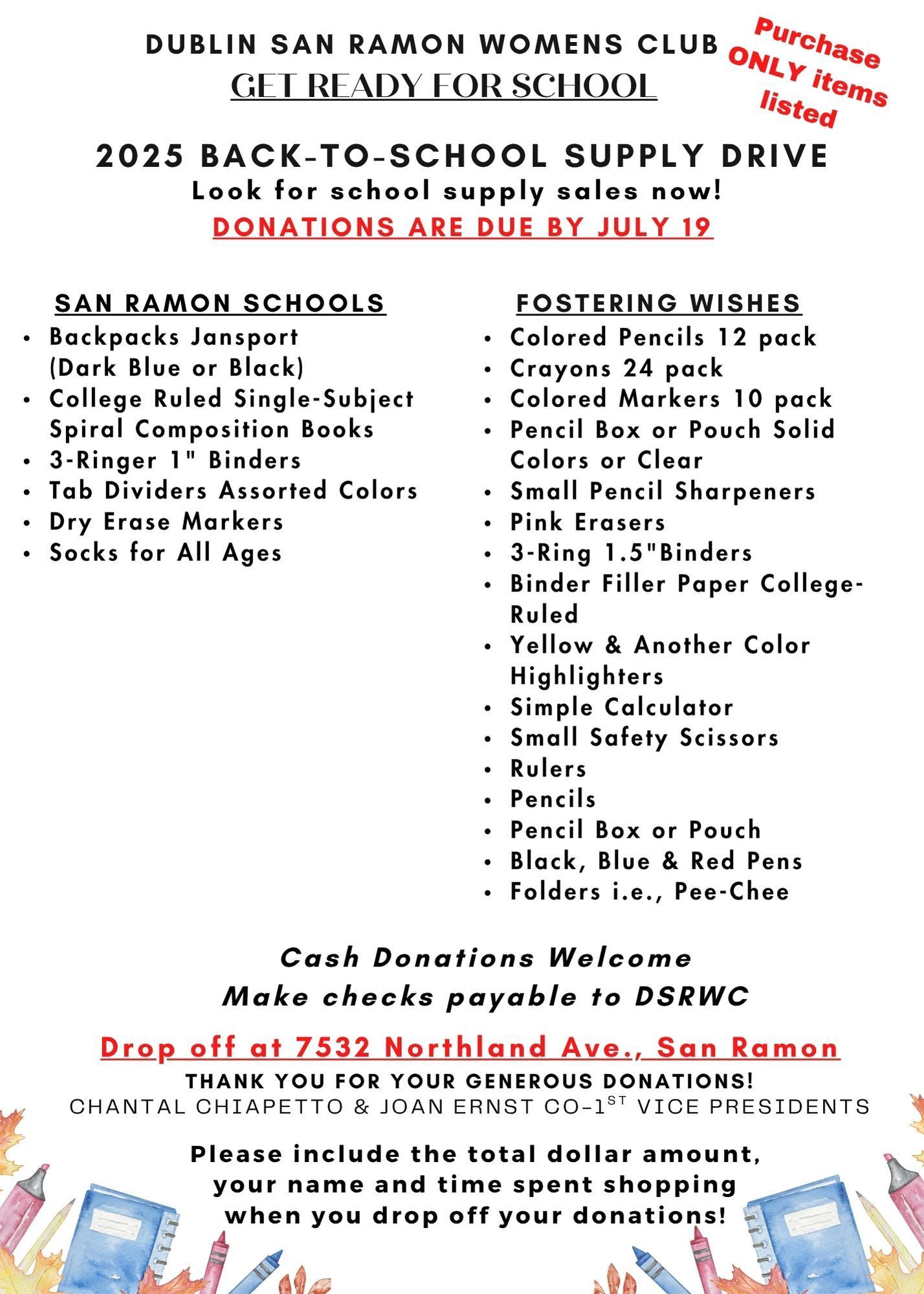 Students will be returning to school August 13, 2025 and the DSRWC will be collecting school supplies for