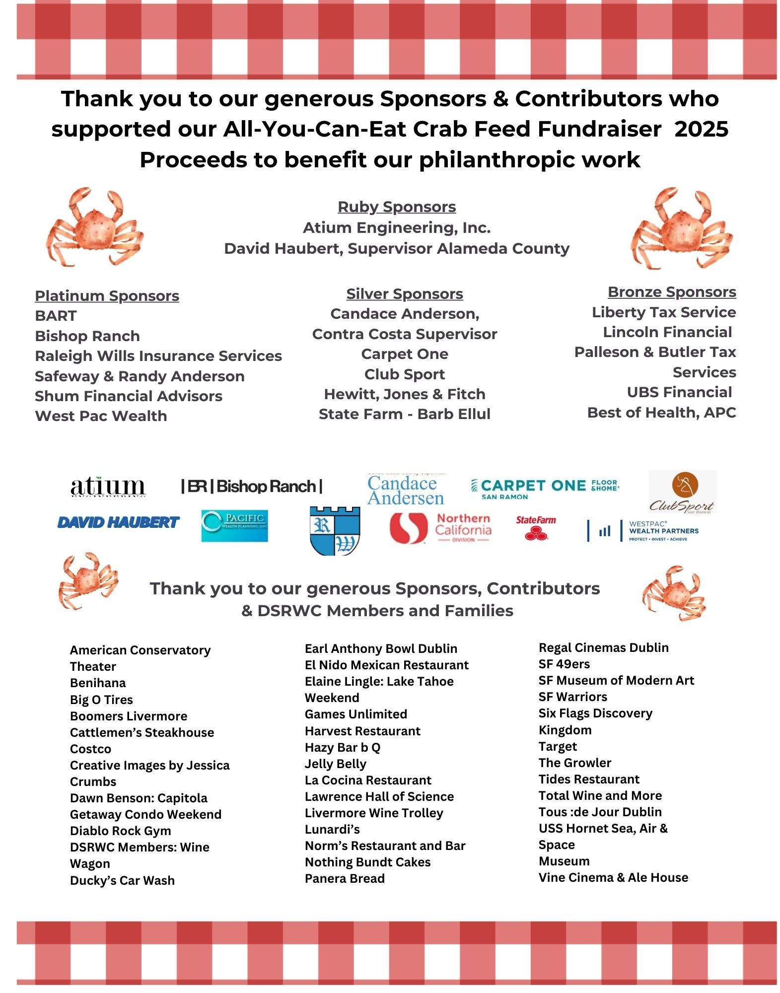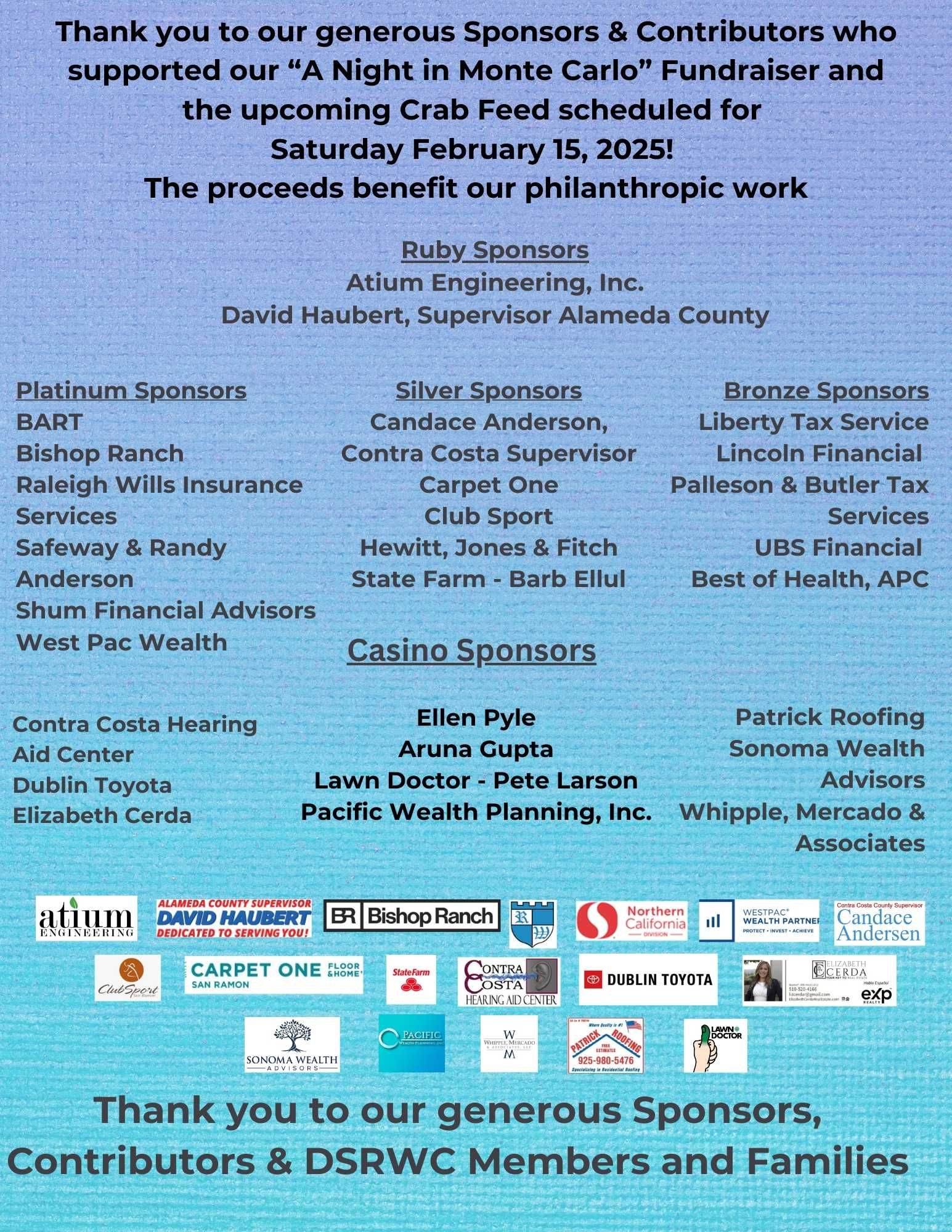 Sponsorships and contributions will carry over to the DSRWC annual Crab Feed. Save the date for Saturday,February 15, 2025.
