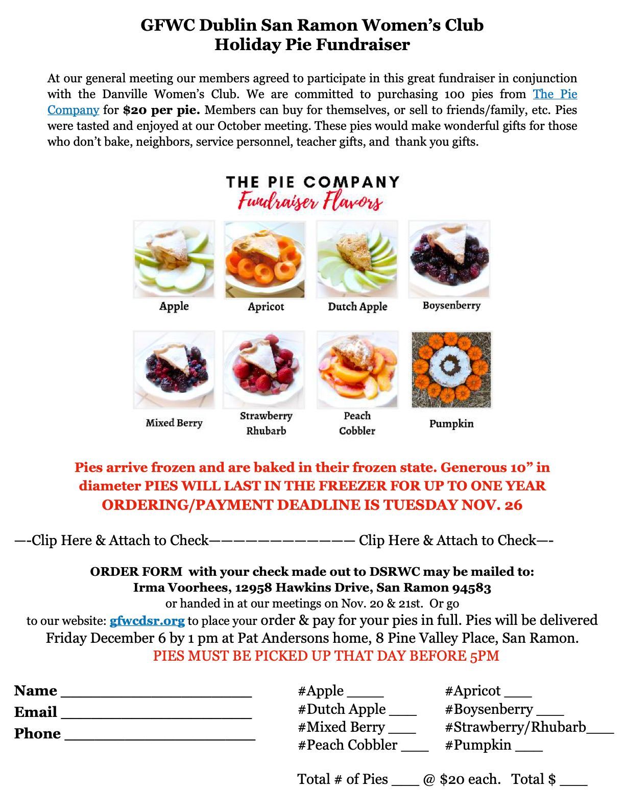 Holidays are coming and what's better than pie for dessert? Our DSRWC "The Pie Company" fundraiser is your opportunity to purchase these generous 10" pies produced by this local wholesale bakery. Fresh from the orchards and fields of the California Central Valley they make great additions and gifts for the upcoming year. Arriving frozen these delectable homestyle pies can keep for up to one year in your freezer. With 8 delicious from which to choose from